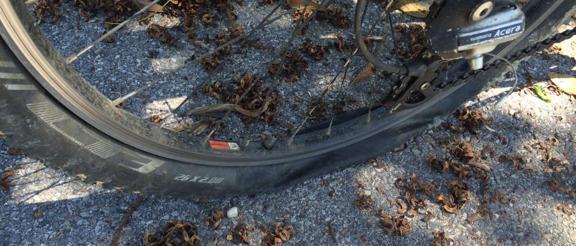 Langsam erholt geht es wieder nach unten zu unseren Bikes. Der Downhill geht einiges einfacher als die Bergfahrt. Man muss aber gut aufpassen um auf dem schmalen Weg nicht nach links oder rechts in den Dschungel zu fallen. Die vielen Steine und die kleinen Flussüberquerungen machen die Fahrt zu einem tollen Trip. Nach etwa 500 Metern auf der normalen Strasse höre ich plötzlich ein „Pffffffffffffff“ und halte an, doch das Geräusch ist immer noch da. Das Hinterrad hat einen Riss und verliert Luft. „Ja, ich habe einen Platten!“. Mein Begleiter nimmt einen kleinen Ast aus meinen Speichen und wir stellen die Velos in den Schatten. Bis zu unserem Hotel geht es sicher noch 6 Kilometer. Er nimmt das Mobiltelefon aus dem Rucksack und versucht Hilfe anzufordern. In der Zentrale hat anscheinend niemand sofort Zeit. Also gehen wir zu Fuss mit den Fahrädern unter dem Arm in der brütenden Hitze die Strasse entlang. Nach einem Kilometer stehen wir vor einem Haus, dass Verwandten von ihm gehört. Es ist niemand zu Hause aber auf einem Bank wartet es sich angenehmer. Da nach 45 Minuten noch niemand gekommen ist, darf ich nun mit seinem Fahrgestell alleine zum Hotel zurück fahren. Er wartet auf seinen Chef der ihn hier irgendwann abholt. Als ehemaliger Pfadfinder ist es für mich natürlich kein Problem zurück zu finden. Unterwegs fotografiere ich noch ein paar tolle Motive, da ich ja meine Halts nun selber bestimmen kann.