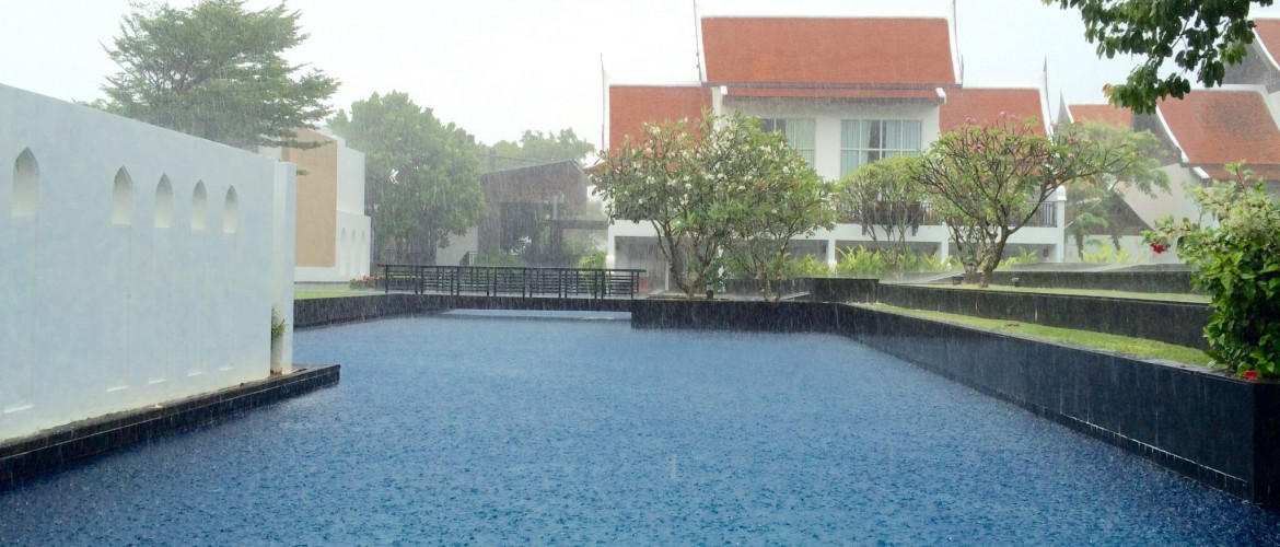 Bereits am Morgen früh im Bett hat man den Regen und den Wind draussen gehört. Es herrscht Sturm und heute ist wohl nichts mit Kaffee trinken auf der Terrasse. Also können wir den Tag ganz langsam beginnen und fühlen uns bei dem Wetter wie in der Schweiz. Beim Frühstück sitzt man wie in einer Waschanlage, hinter der grossen Glasfront zum Meer. Die Hochzeitsgesellschaft hatte gestern aber ein riesen Glück, dass sie den einzig trockenen Abend ausgesucht haben. Der Strand bleibt heute wahrscheinlich leer und die Leute verkriechen sich auf die eigenen Terrassen oder ins Zimmer. Wir platzieren uns natürlich auch bei uns auf die Liegestühle und geniessen die Abkühlung. Es ist schon praktisch, dass man direkt vom Zimmer ohne nass zu werden, in den Pool springen kann.